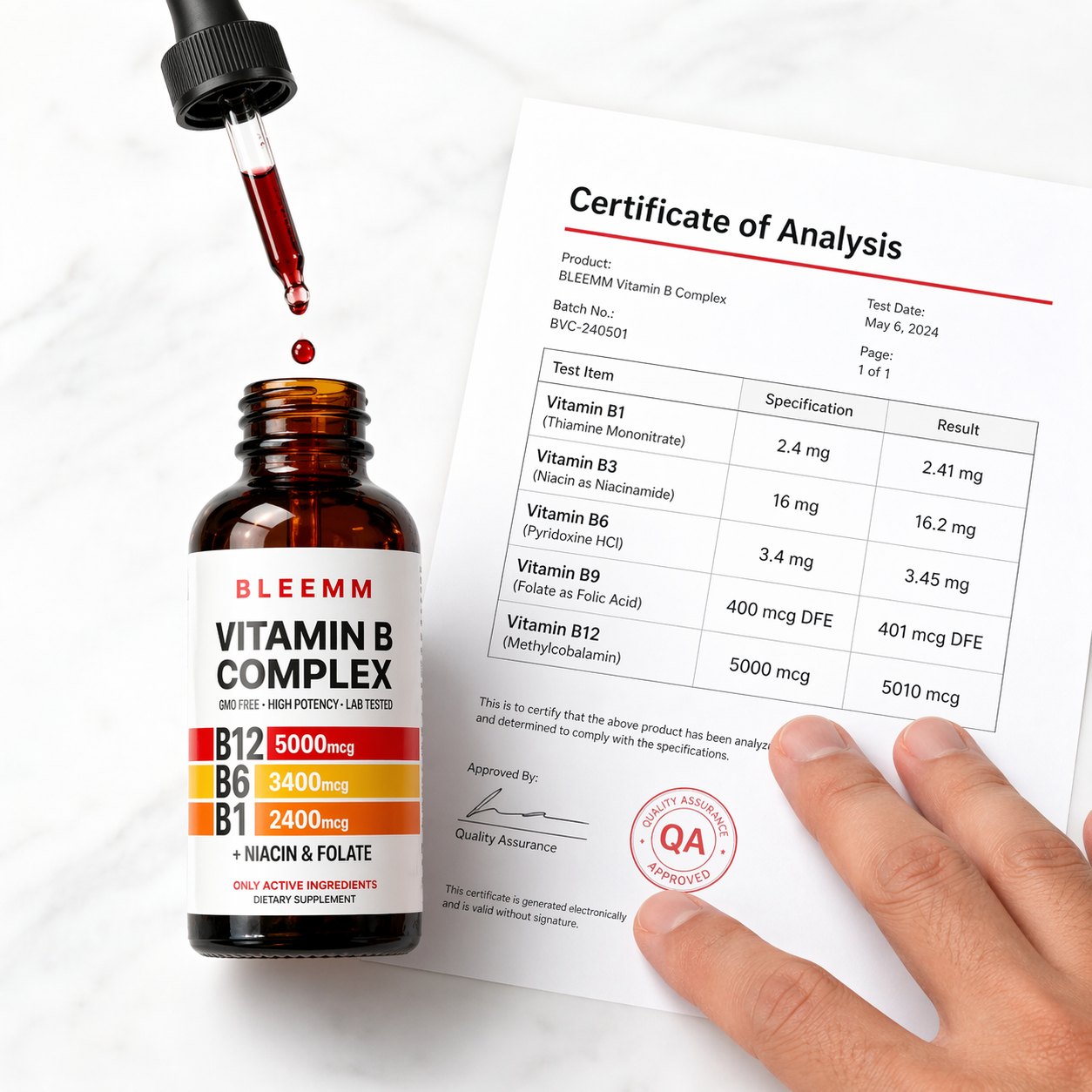 A Certificate of Analysis (COA) is a document from an independent third-party lab that tests every vitamin in every batch and confirms the exact dose present. Most brands say "lab tested" but never show you the actual results — you're just supposed to trust them. Bleemm publishes the COA for every production batch on our website.You can read the exact tested numbers for every vitamin before you buy a single bottle. No other mass-market B complex does this.