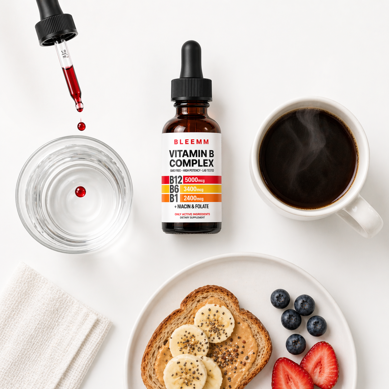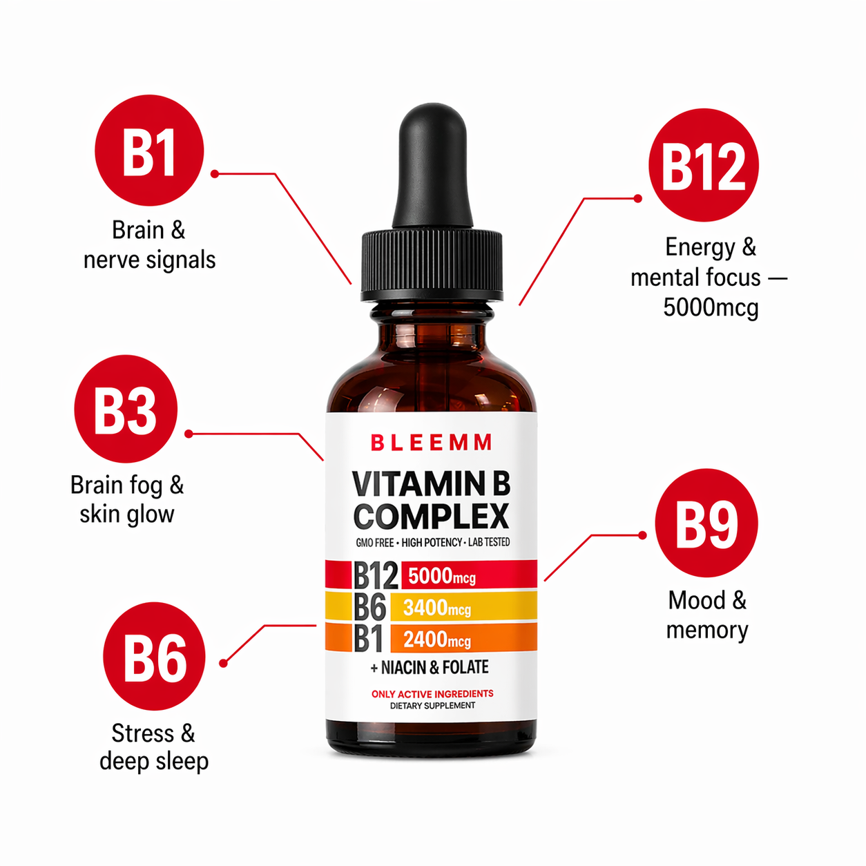 Bleemm B Complex uses the most bioavailable forms of B1, B3, B6, B9, and B12— the essential nutrients your body needs daily to produce energy, regulate mood, and support your nervous system. Because it's a liquid, it absorbs directly into your bloodstream — no waiting for a tablet to dissolve, no guessing if it's working. Every dose is precisely measured and independently lab-verified so your body gets exactly what it needs, every single time.